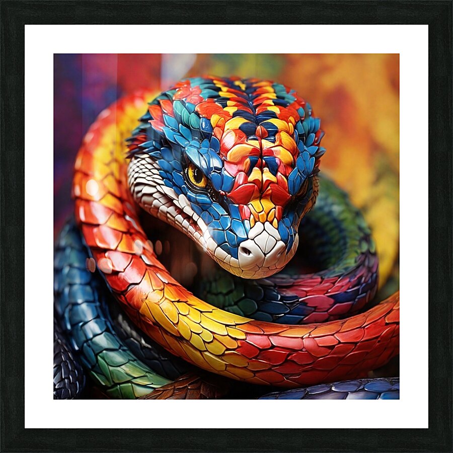 This captivating artwork presents a mesmerizing close-up of a snake, transformed into an explosion of chromatic brilliance. The creature, centrally composed within a stark black frame, is depicted in a coiled posture, its body a symphony of intricate scales rendered in a kaleidoscope of hues. Each scale is a tiny facet, reflecting and refracting light, painted with astonishing detail in vivid blues, fiery reds, sunlit yellows, lush greens, deep purples, and oranges. This riot of color is not confined to distinct patterns but flows and blends across its serpentine form, creating an almost mosaic-like appearance that challenges conventional biological representation. The audacious use of color transforms an animal often associated with fear or danger into an object of pure aesthetic delight, embodying a fierce beauty that is both arresting and profoundly inspiring.